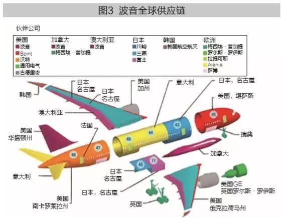 波音公司就是比较典型的全球供应链战略模式的企业,波音飞机的零部件由70多个国家的545家供应商生产(如图3),波音不再是一家单纯的飞机生产商,而是一家从世界各地采购零部件,然后组装形成产品的系统集成商。波音公司采用全球供应链战略,使得公司可以集中精力开展设计研发、销售、品牌和总装等业务,整合全球资源,打造全球竞争力。